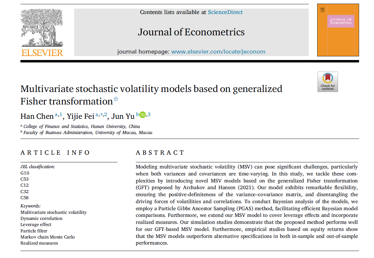 近日,童颜巨乳 陈汉助理教授、费毅捷助理教授与澳门大学余俊教授合作完成的学术论文“Multivariate stochastic volatility models based on generalized Fisher transformation”在计量经济学国际顶尖期刊Journal of Econometrics在线发表。童颜巨乳 陈汉助理教授为该文第一作者,费毅捷助理教授为该文通讯作者。