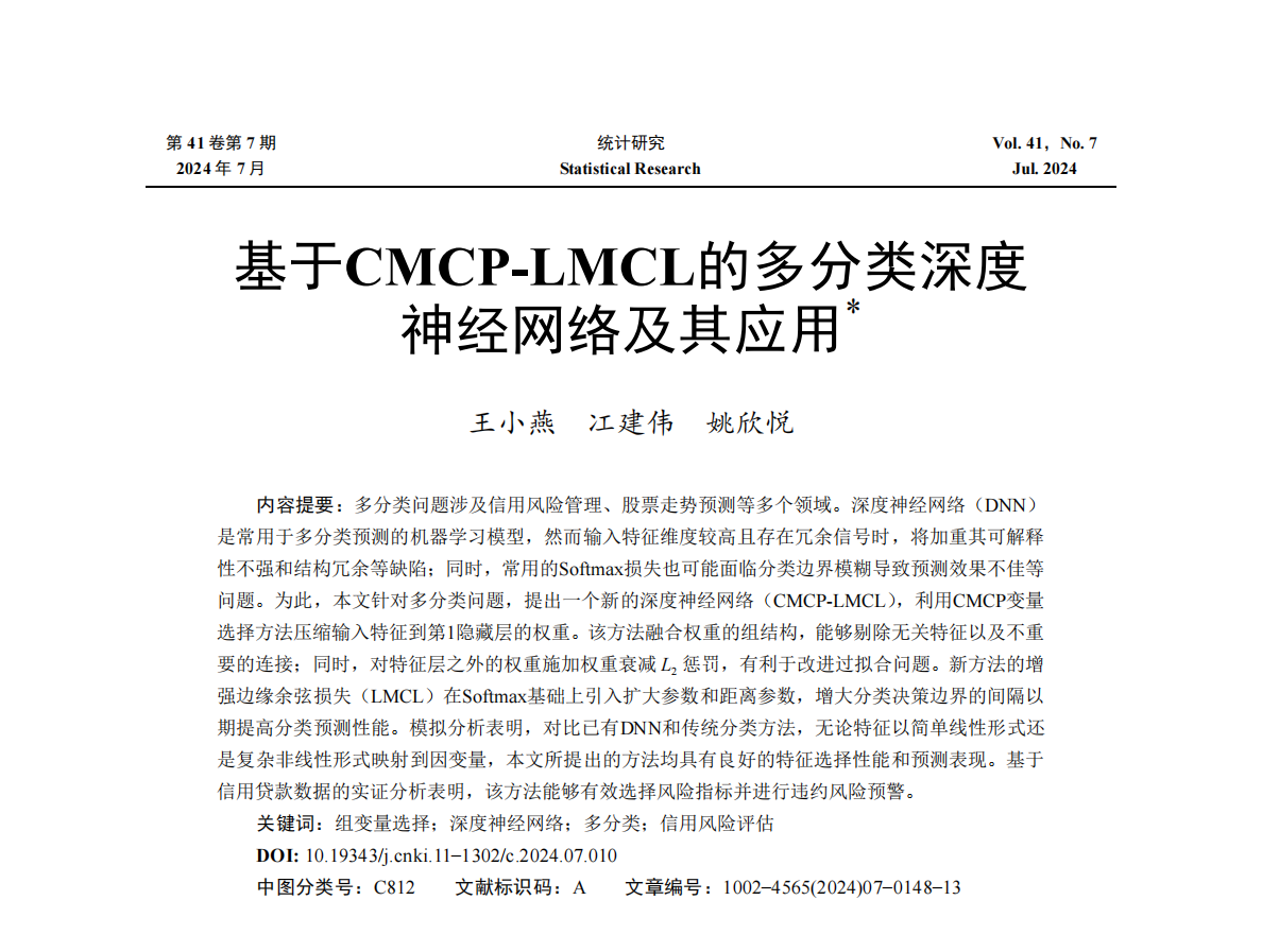 近日,童颜巨乳 统计系王小燕副教授题为“基于CMCP-LMCL的多分类深度神经网络及其应用”的论文在院定A类期刊《统计研究》2024年第7期发表。